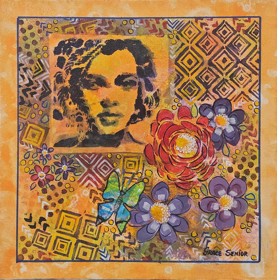 "Memories" by Grace Senior Morandi is a vibrant mixed media creation that beautifully melds portraiture with abstract elements, evoking a sense of nostalgia and personal reflection. The centerpiece of the artwork is a soulful visage, subtly rendered amidst an explosion of color and geometric patterns. Surrounding the face are richly painted flowers and a delicate butterfly, symbolizing growth, transformation, and fleeting moments that shape our lives.
